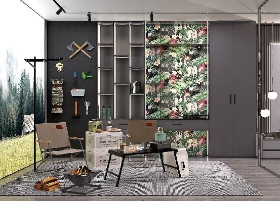“丛林派对”系列为热爱露营的人群开发。热带雨林风的数码背板提亮各个空间,浓烈的丛林气息让家迸发自然活力,营造居家度假氛围。在收纳设计上,洞洞板+开放式收纳区+掩门式收纳柜,让各种露营工具有了妥当的安置。年轻人们热衷于享受生活仪式感带来的小确幸,充足的收纳空间和人性化的布局规划满足了人们随心在家开营的乐趣,帐篷一支就是一个隔绝外界纷扰,安全感满满的乌托邦、桃花源。这两年帐篷已经成为儿童房标配,小红书上居家露营的帖子也非常多,身虽未至心已往之。