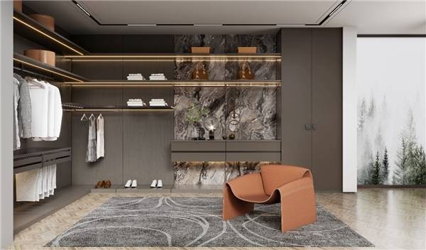 撷取自然神韵的云脉石纹数码背板,贯穿于客餐厅、卧室、衣帽间等各个空间,云山气息在家居空间中流淌。流金咖、琥珀金咖门板,熔岩灰柜身,搭载岩石拉手和光影拉手,在色系和造型上形成呼应。 衣帽间采用壁挂系统+折叠门设计,开启面大,不仅大气而且拿取衣物更加方便。准分子UV门板,质感细腻高级,不留指纹还能轻松修复划痕。