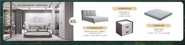 丛林派对系列搭配的随心选全屋家具,包括浅绿色科技皮沙发、绿色绒布单椅、极简岩板餐桌椅+茶几、青城灰软床、床头柜、抗菌亲肤床垫等,在色彩上互相呼应,材质上形成丰富的层次感并且易于保养打理。